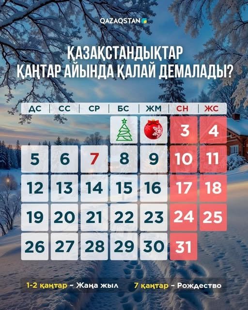 Жаңа жыл мерекесіне орай ресми демалыс күндері – 1 және 2 қаңтар. Сондықтан қазақстандықтар 4 күн қатарынан демалады. Ал 7 қаңтар – Рождество сәрсенбіге сәйкес келеді, апта ортасында тағы бір демалыс күні болады.