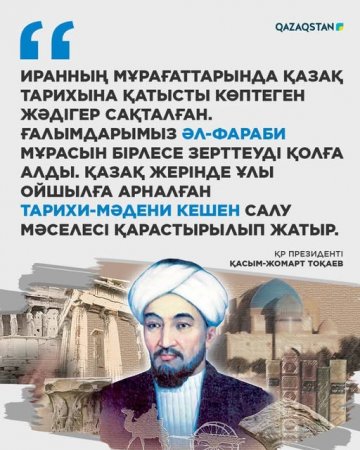 «Иранның мұрағаттарында қазақ тарихына қатысты көптеген жәдігер сақталған. Ғалымдарымыз әл-Фараби мұрасын бірлесе зерттеуді қолға алды. Қазақ жерінде ұлы ойшылға арналған тарихи-мәдени кешен салу мәселесі қарастырылып жатыр», - деді Президент жиында.