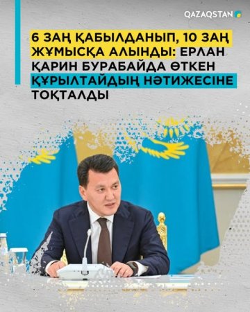 «Құрылтайдың төртінші отырысынан кейін Мемлекет басшысының тапсырмасын орындау мақсатында 53 тармақтан тұратын арнайы жоспар бекітілді. Осы жоспарға сәйкес, бірнеше бағытта жұмыстар жүргізілді. Біріншіден, құрылтай бастауларын жүзеге асыру барысында Парламент депутаттарының қолдауымен былтыр 6 заң қабылданды. Бұған қоса осы уақыт ішінде тағы 10 заң жобасы жұмысқа алынды», - деді Мемлекеттік кеңесші Ерлан Қарин Қызылордада өтіп жатқан V Ұлттық құрылтайда.