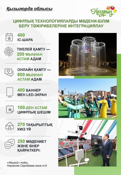 Қызылорда облысы мәдени-ағартушылық тәжірибелерге жоғары технологияларды енгізуге басымдық берді. Өңірде ауқымды мерекелік іс-шаралар ұйымдастырылып, 400 шара офлайн форматта 200 мыңнан астам адамды қамтыды, ал онлайн кеңістікте 800 мыңнан астам қолданушы назар аударды.