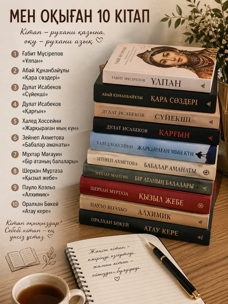 Кітап оқу – тек уақыт өткізу емес, ол – өзіңді тану, өмірді тереңірек түсіну. Осы акция аясында мені ерекше ойландырған, жан дүниеме әсер еткен кітаптардың тағы бір тізімімен бөлісуді жөн көрдім.